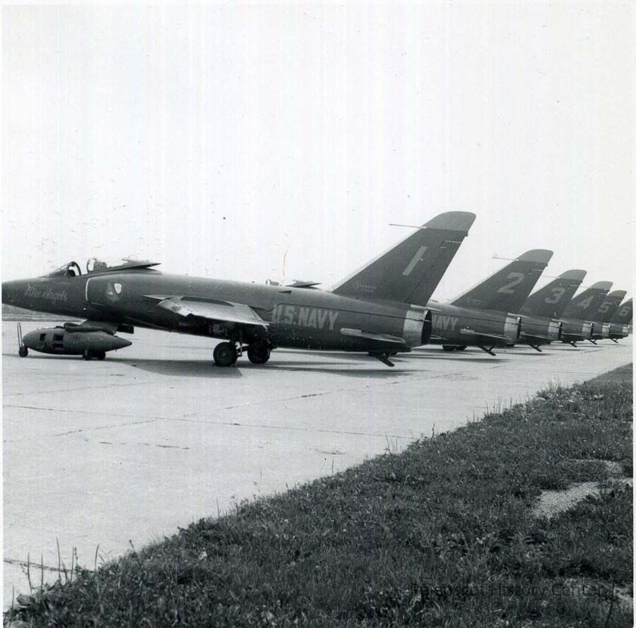 A B/W photograph of the Blue Angel's airplanes. Undated F-11 Tiger cats