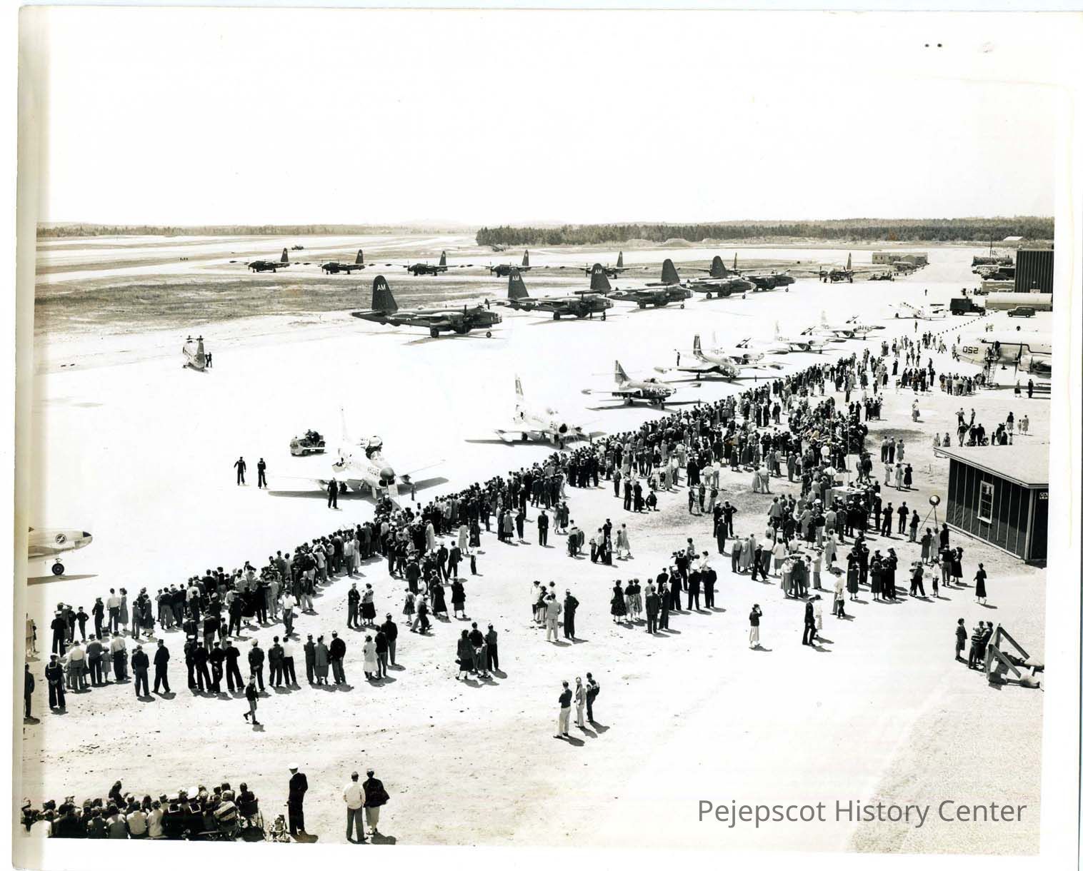 The 1950 BNAS air show. The aircraft in the background are P2V-5s. Aircraft in the foreground left to right are, T-33, F86D, F86A, F94, FH-2, T-33, BEECH-18. The aircraft behind the crowd is a C-54A. UndatedLexicon