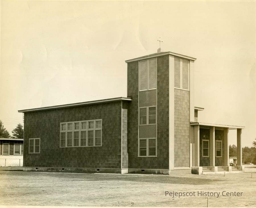 A B/W photograph of the Chapel at the Brunswick Naval Air Station, Brunswick, Maine (BNAS). The chapel was demolished and rebuilt ca. 1960. Undated