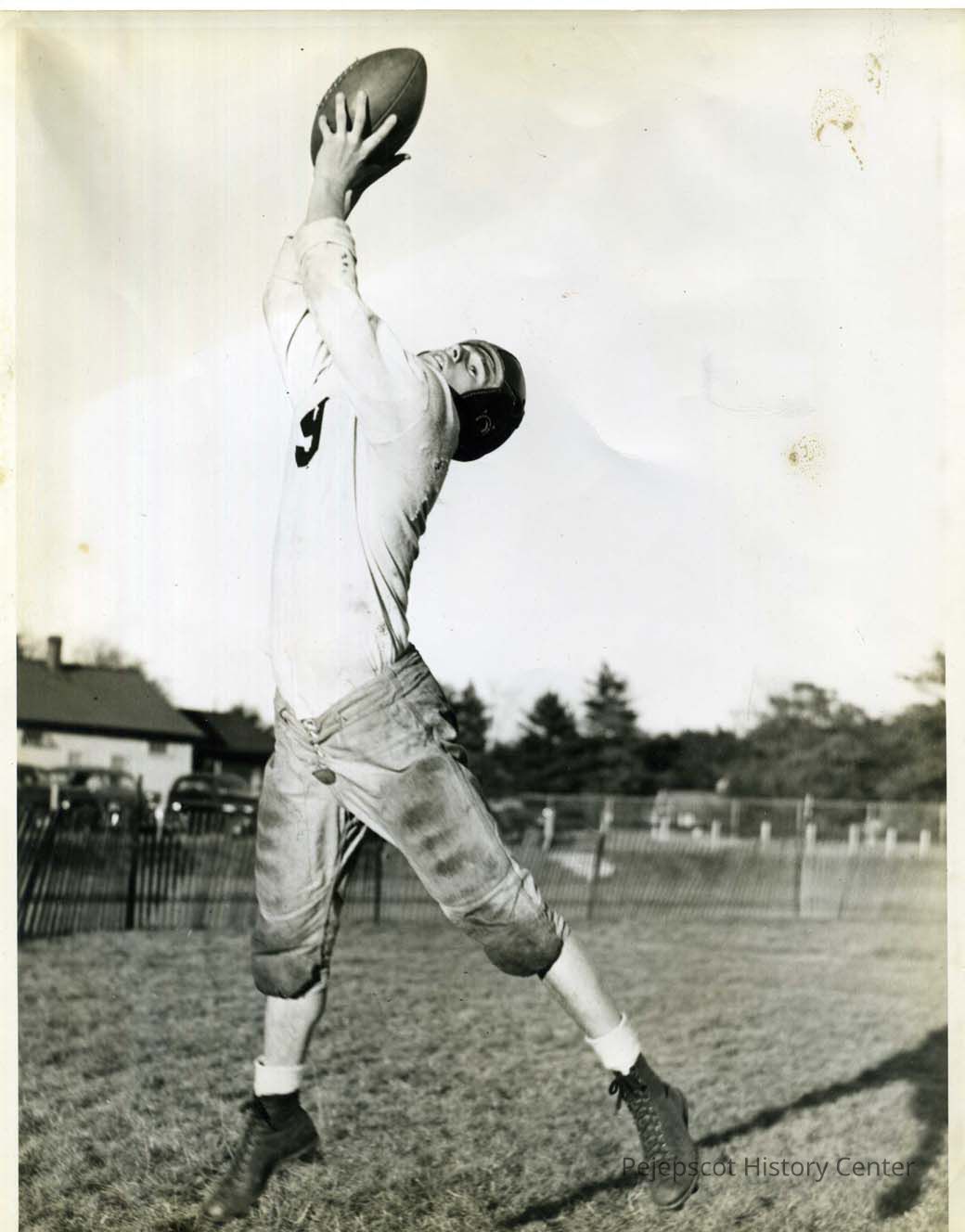 Bob Lord in football uniform in 1948 catching a pass. Undated