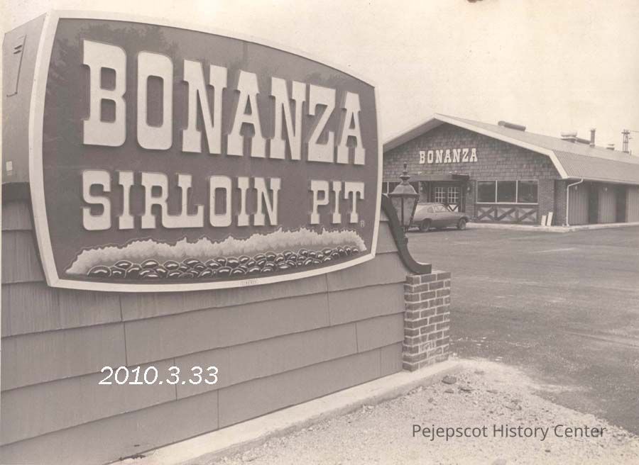 A B/W photograph of Bonanza Sirloin Pit sign and store front at Cook's Corner, Brunswick. Undated