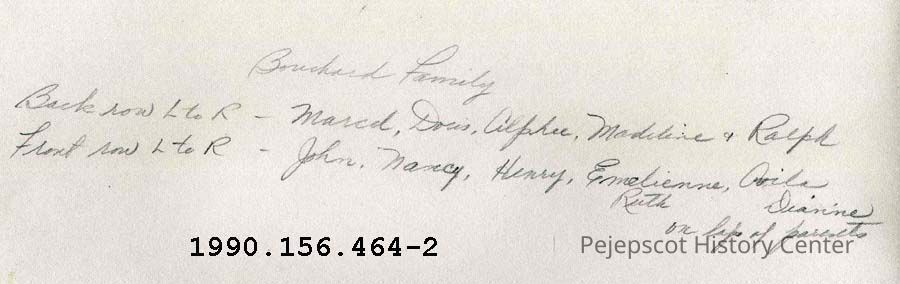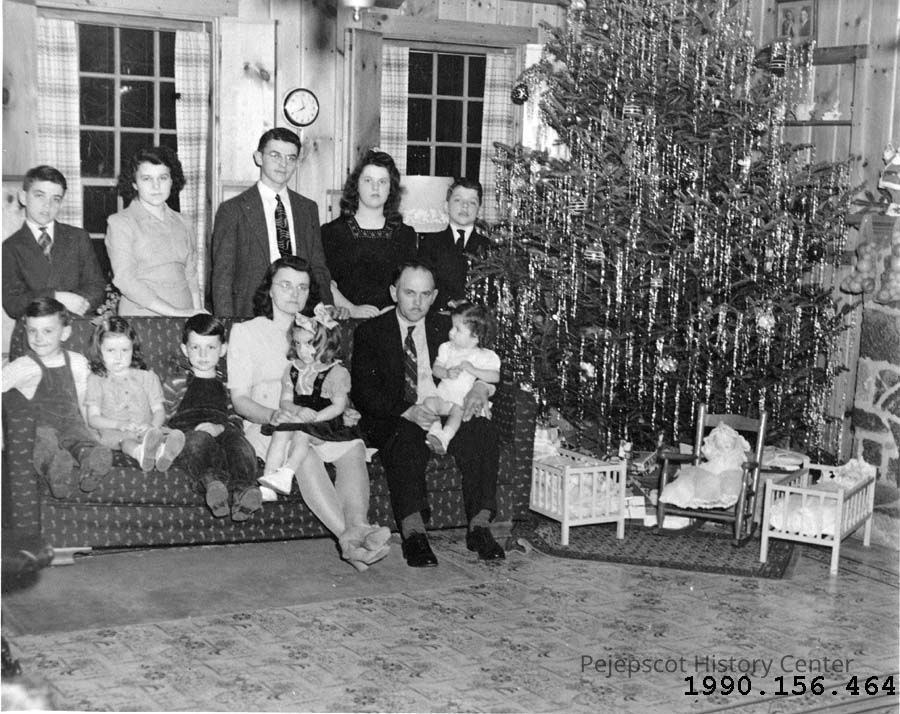A B/W photograph of the Bouchard family. Back row left to right: Marcel, Doris, Alphee, Madeline and Ralph. Front row left to right: John, Nancy, Henry, Emelienne, Ruth on the lap of her mother; Avila and Dianne on the lap of her father. UndatedCollection