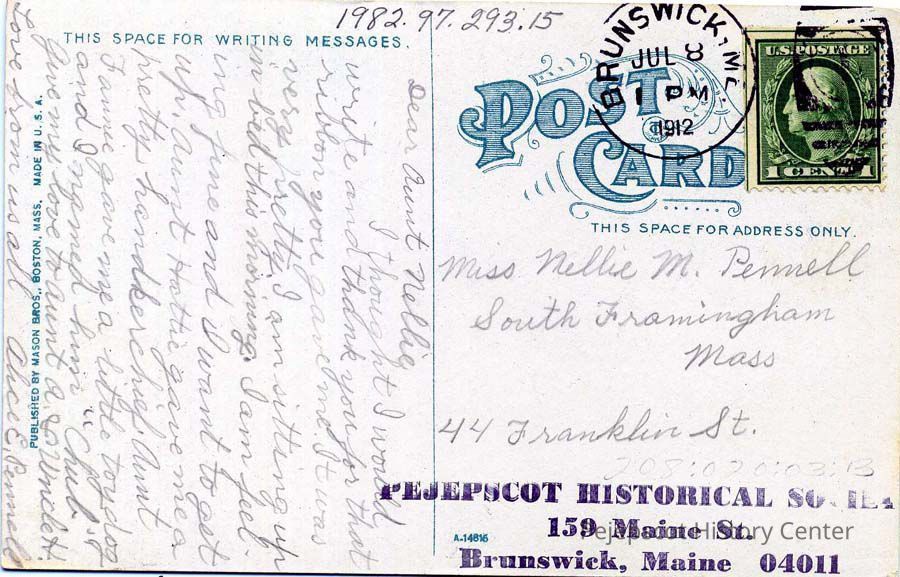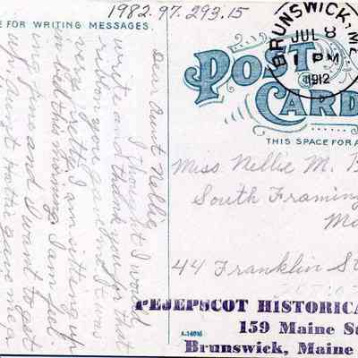 Color postcard of a view of the Bowdoin College campus. To Miss Nellie M. Pennell, 44 Franklin St., So. Framingham, Mass. Postmarked Brunswick, Maine, July 8, 1912.