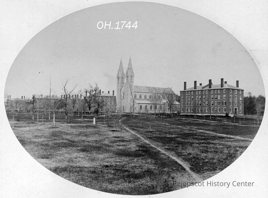 A B/W photograph of Bowdoin Campus, Brunswick, ME showing the Chapel and surrounding buildings. Not dated.
