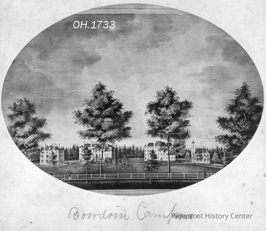 A B/W etching of Bowdoin Campus, Brunswick, ME. Oval in shape. Not dated.