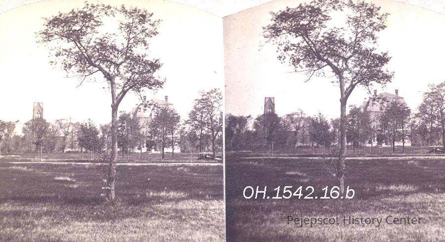 A stereo view of Memorial Hall on Bowdoin College Campus, Brunswick, ME. In 1865, a meeting of the alumni considered what measures should be taken for a monument or memorial for the sons of Bowdoin College who had died or taken part personally in the war. It was decided that a memorial building was the form the monument should take. It was urged that in the building there would be inscriptions, busts, portraits, flags, etc. that could be preserved. The college was also in need for more lecture-rooms, a hall for exhibitions, and a common rallying point for the alumni so these were also added to the memorial building. Prof. William Smyth was primarily responsible for the building's design and fundraising. Today, The Memorial Hall is known as Pickard Theatre. 1894.Collection