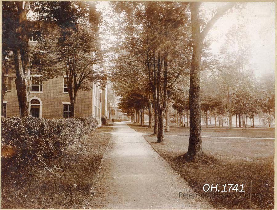 A B/W photograph of a walkway beside Bowdoin Campus buildings, Brunswick, ME. Not dated.