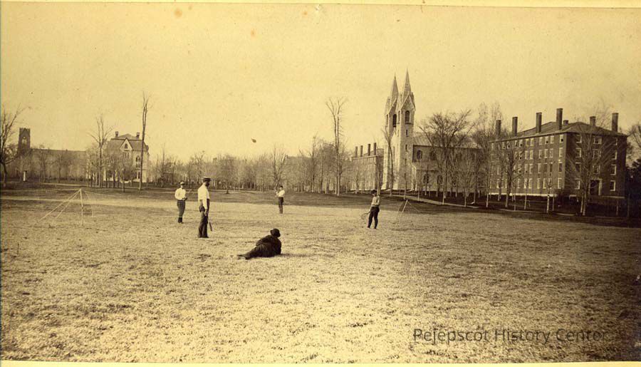 A black and white photo of Bowdoin College campus, Brunswick, Maine. Four men are playing tennis on the lawn and another man is laying on the lawn watching. Behind them you can see the Pickard Theater and the Chapel. On the back is written "Blanche French Dec. 11-1890" and in the upper right corner, "Bowdoin Campus F.G.F. '94".