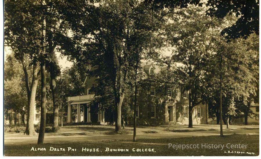 B/W Postcard of Alpha Delta Phi House at Bowdoin College.