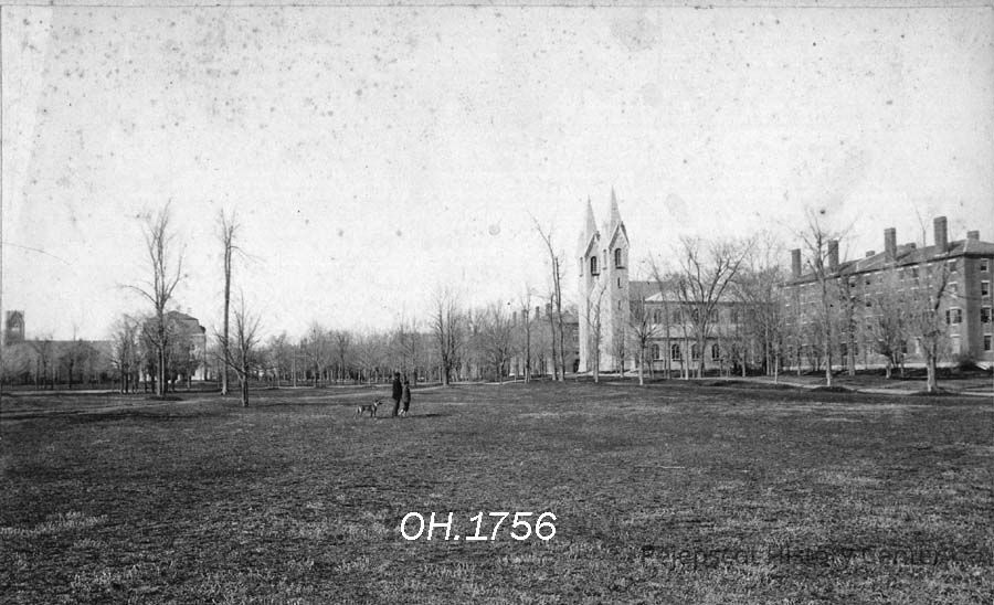 A B/W photograph of Bowdoin College Campus, Brunswick, ME. King Chapel can be seen. Not dated.