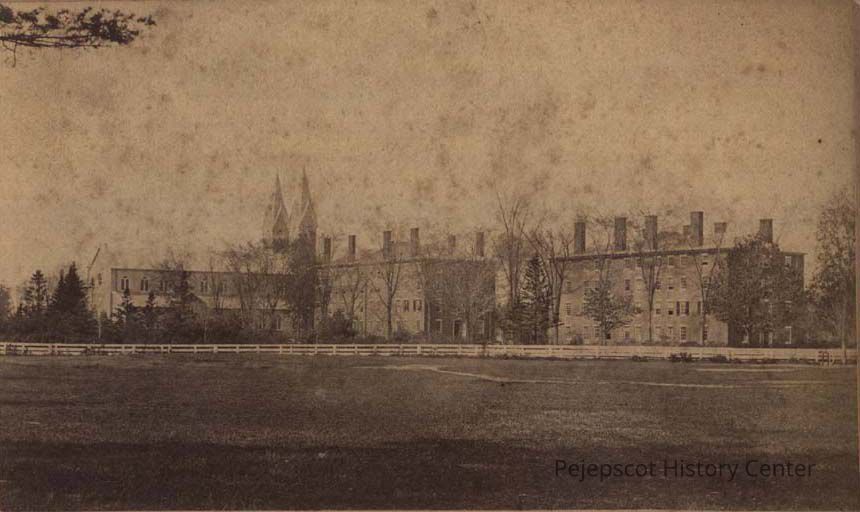 A B/W photograph of Bowdoin College campus, showing two of the classroom buildings and the King Chapel. Undated