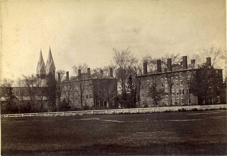 An undated black and white photo of the Bowdoin College campus in Brunswick, Maine.