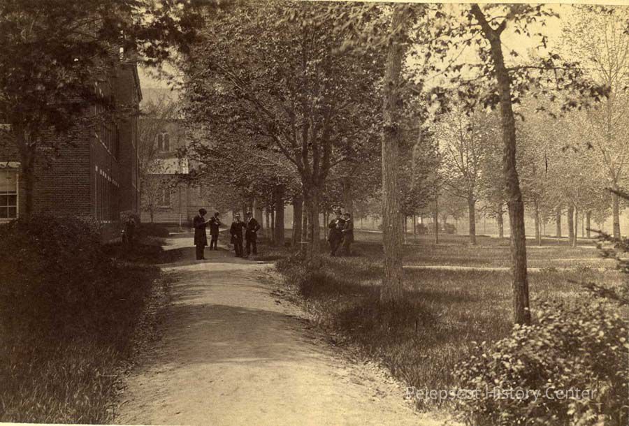 An undated black and white photo of the Bowdoin College campus in Brunswick, Maine with several men standing around.