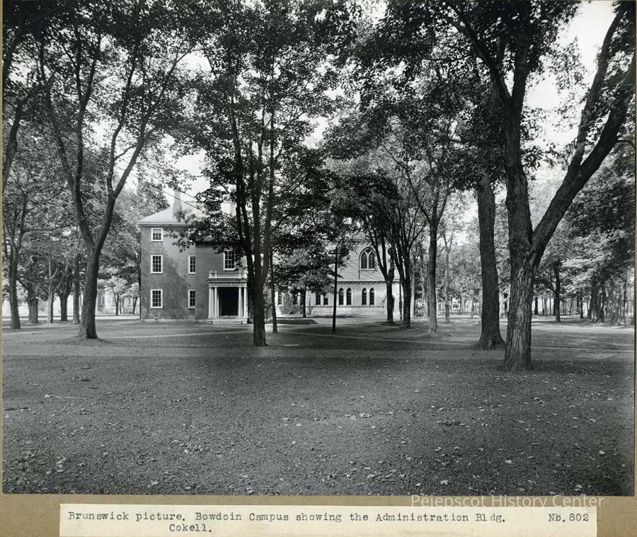 A black and white photo of Bowdoin College campus looking at the Massachusetts Hall when it was the administration building. Past it on the right is Memorial Hall. Undated