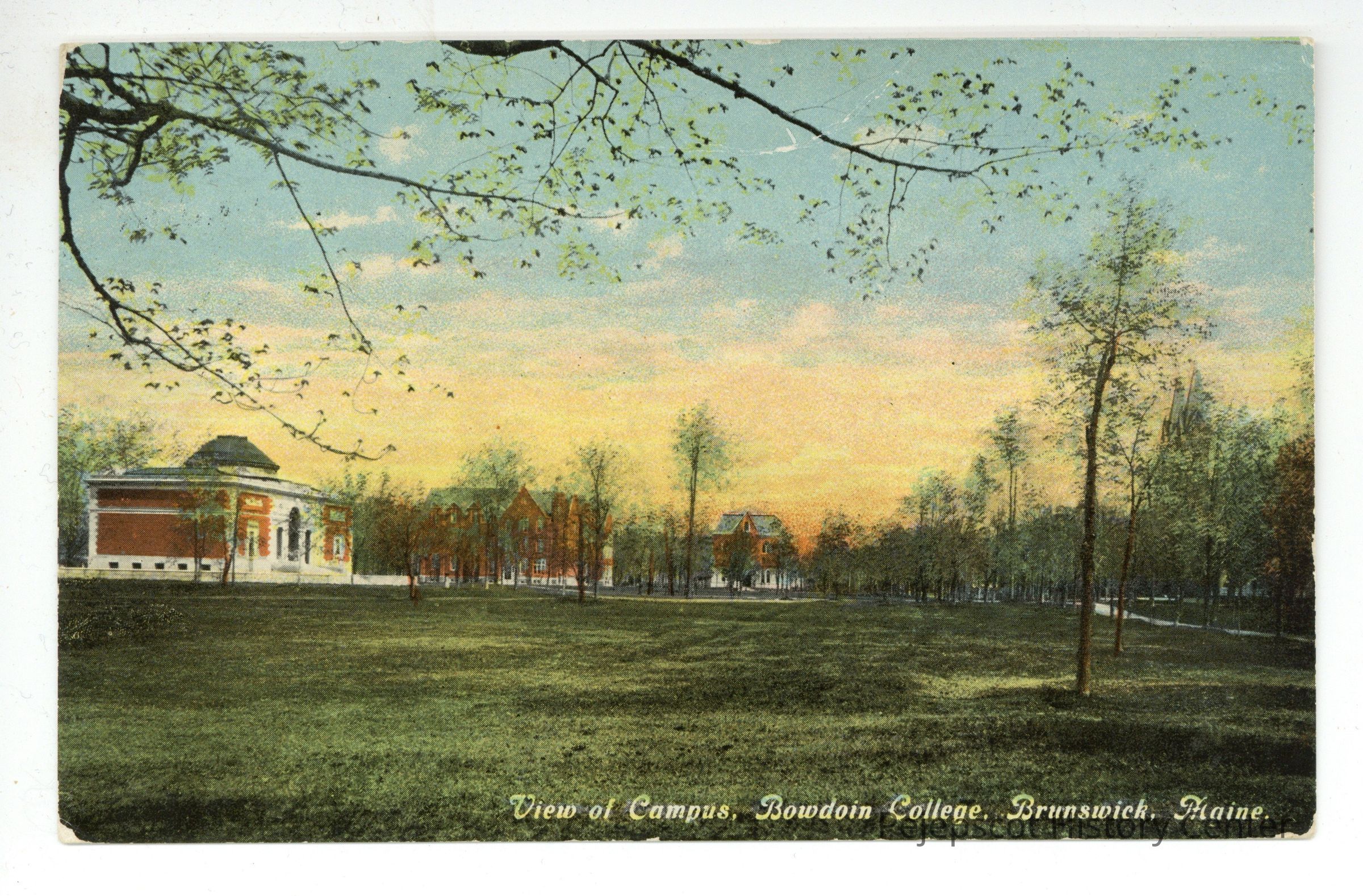 A colored postcard "view of campus, Bowdoin College, Brunswick, Maine." The postcard shows the Walker Art Building on the left, the Searles Science Building next to that, and Memorial Hall in the distance. The top of the Chapel can be seen in the trees on the right.