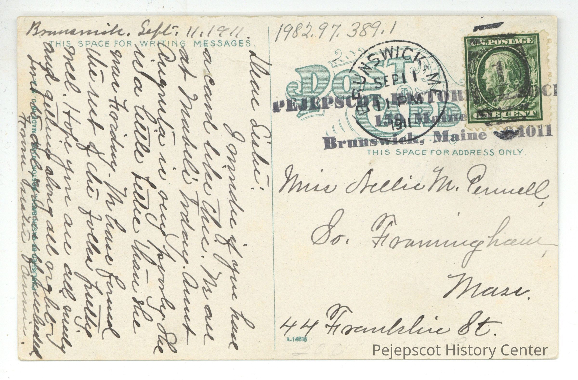 The back of the postcard is addressed to "Miss Nellie M. Pennell, So. Framingham, Mass., 44 Franklin St." and reads: