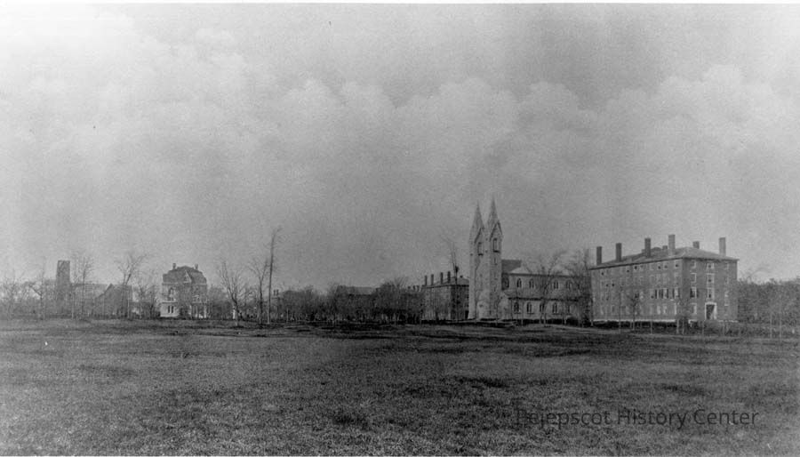 A black and white photo of the Bowdoin College Campus, probably at the time Joshua L. Chamberlain was President of Bowdoin College.