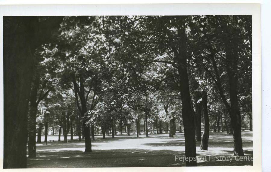 A B/W photograph of the trees on Bowdoin College's campus in Brunswick, ME. Undated.