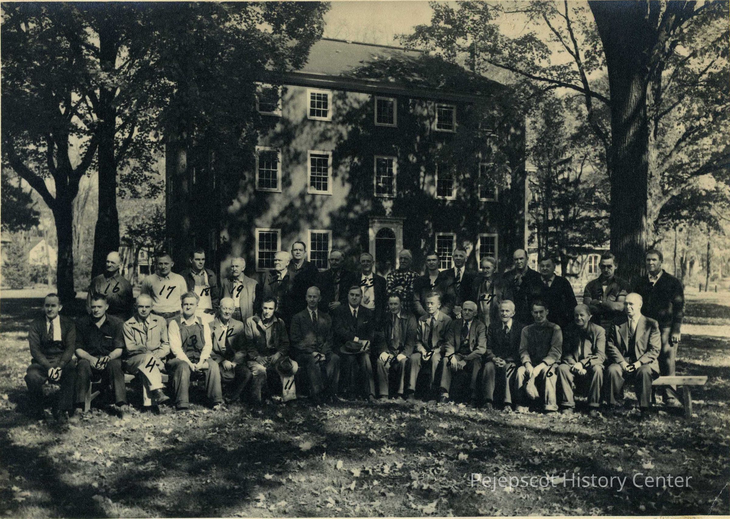 B/W photo of Bowdoin College employees, taken in front of Massachusetts Hall. Attached: "President K.C.M. Sills, 2. G.R.Mc.Intire, Busar, 3. W.K. Hall, Ass. Bursar, [?] Potter, Super. 5. W. Rose, 6. H. Gatchell, 7. W. Frost, 8. A. Langford, [?] Stimpson, 10. E. Varney, 11. P. Gruenwald, 12. A. Dunning, 13. L. Stone, 14. S. Toothaker, 15. B. Varney, 16. F. Moseley, 17. A. Nadeau, 18. R. Litchfield, 19. V. Cobb, 20. A. Litchfield, 21. J. Howard, 22. A. Totman, 23. J. Moody, 24. F. Hunt, 25. B. Libby, 26. G. Blanchard, 27. W. Walker, 28. H. Ormsby, [?] 30. W. Coombs, [?] Men Retired #18, 19." 1944.Lexicon
