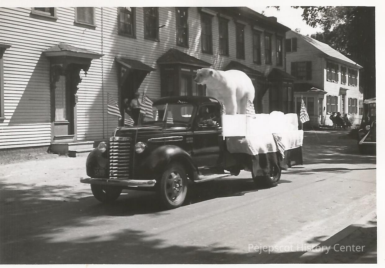 A B/W photo of a Bowdoin College float carrying a taxidermied polar bear (shot in the arctic by Donald MacMillan, 1915) in Brunswick's 200th Anniversary parade. Undated