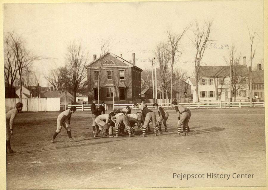 A black and white photo of students playing football on the Bowdoin College football field on the delta. The photo is taken looking towards the ROTC building, which is the 2.5 story brick building behind the field. Brunswick, Maine. No dated.
