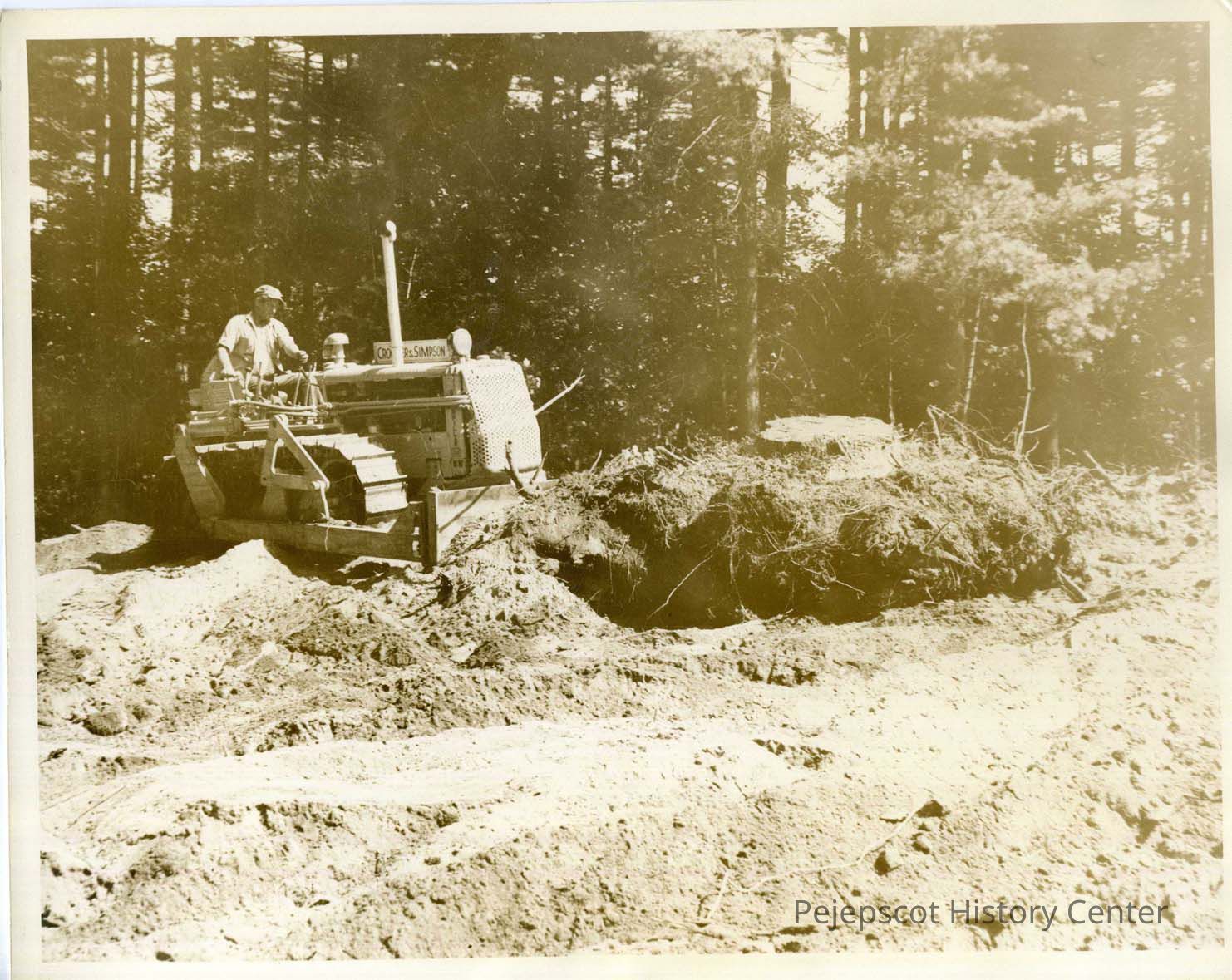 A photo of a Crooker and Simpson bulldozer preparing the ground for moving "The President's Gateway" to a new location on the Bowdoin College campus. Undated