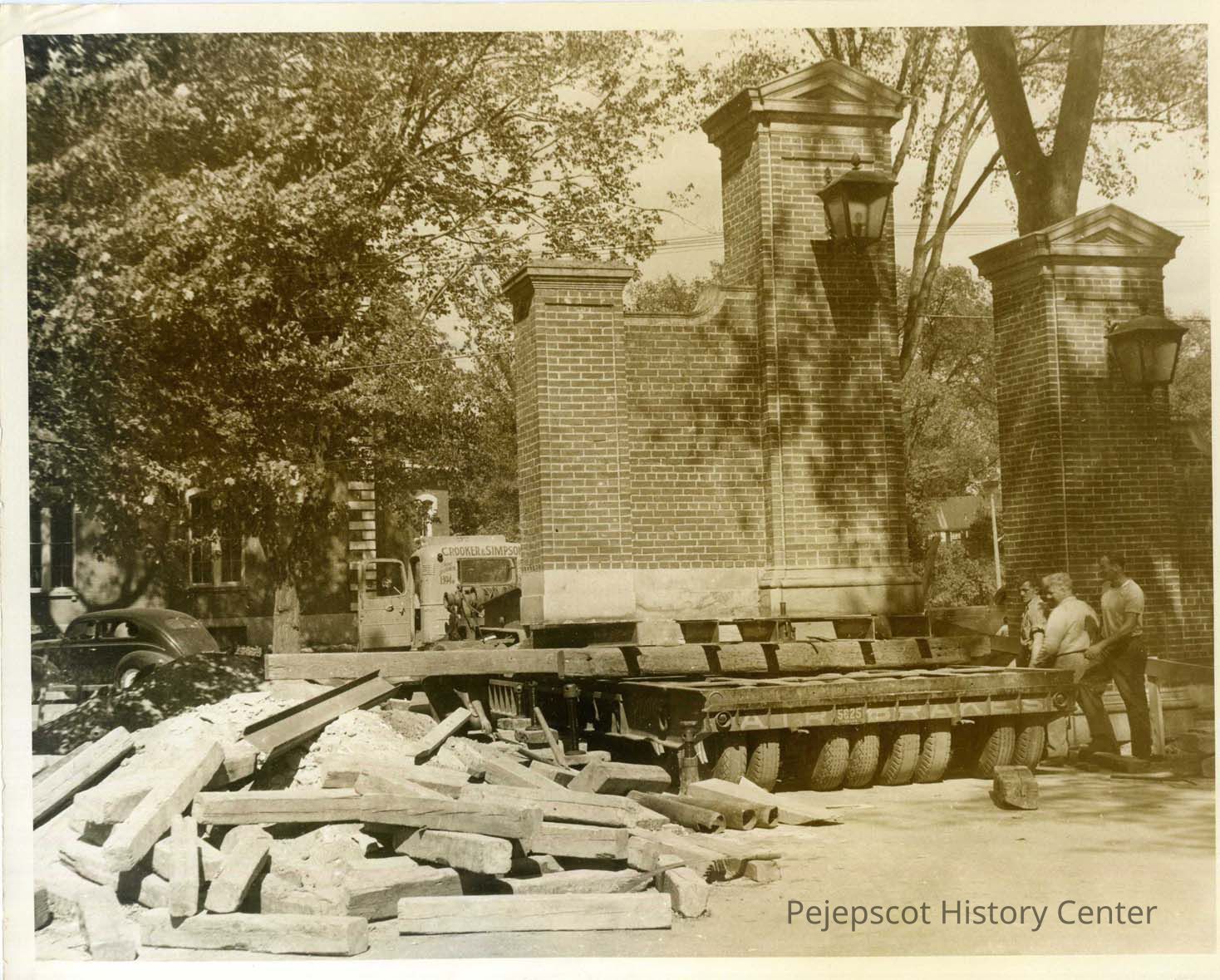 Moving '"The President's Gateway" on the Bowdoin College campus in 1948. President Hyde is noted on the back of the photo. Undated