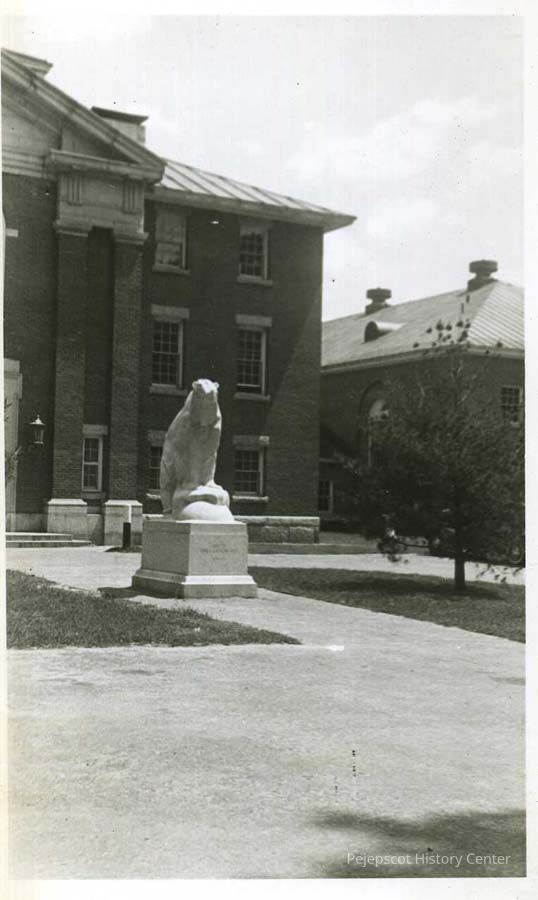 A B/W photograph of the statue of the Bowdoin College Polar Bear. Undated.