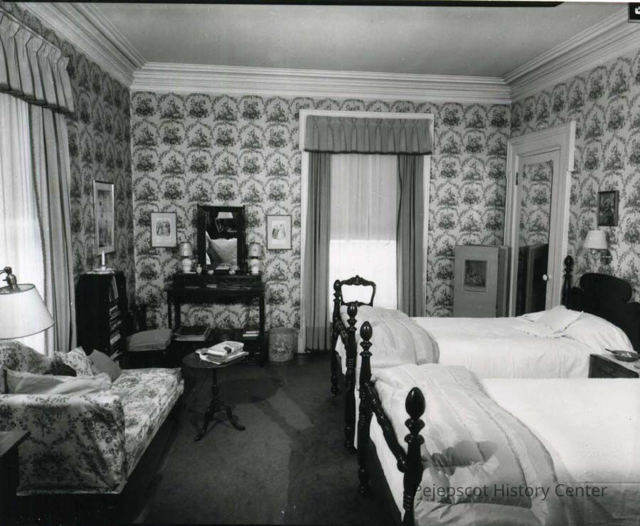 B/W photo of bedroom in Bowdoin College President's House at 85 Federal Street, Brunswick, ME, during presidency of Kenneth C.M. Sills (1918 - 1952). No date.