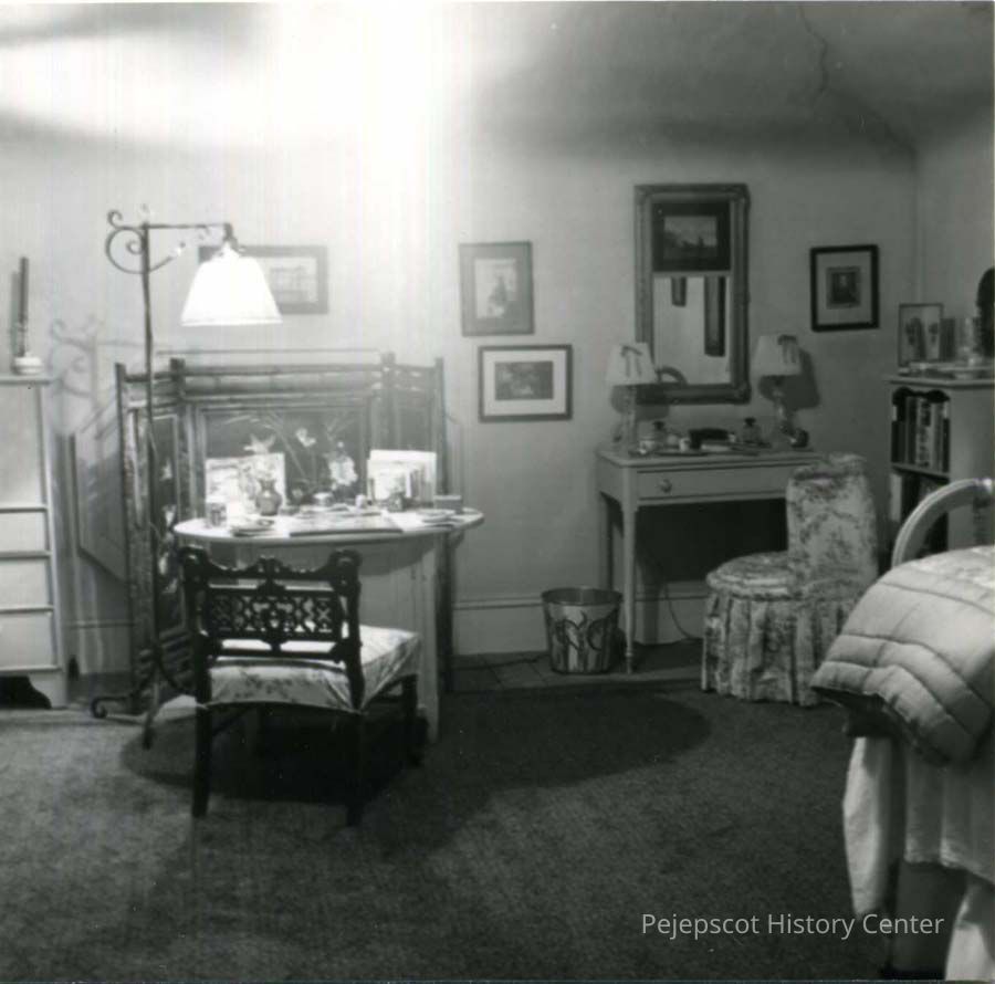 B/W photo of the guest room in the Bowdoin College president's house, 85 Federal Street, Brunswick ME, during the presidency of Kenneth C.M. Sills (1918-1952). No date.