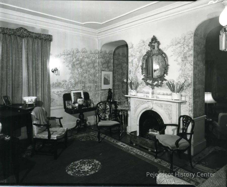 B/W photo of the parlor in the president's house at Bowdoin College, 85 Federal Street, Brunswick, ME, during the presidency of Kenneth C.M. Sills. No date.