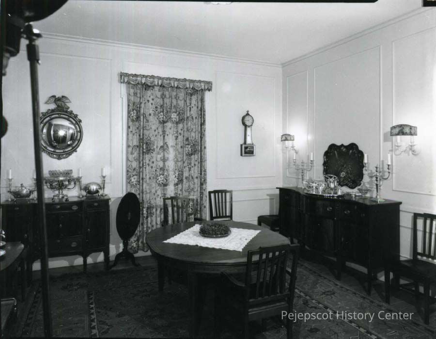 B/W photo of the dining room in the Bowdoin College president's house, 85 Federal Street, Brunswick, ME, during the presidency of Kenneth C.M. Sills (1918-1952). No date.