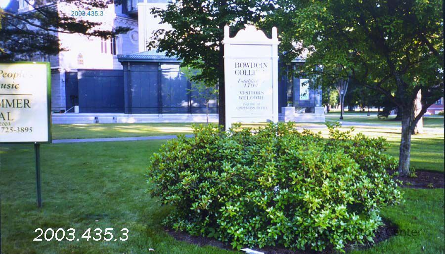 A color photograph of the Bowdoin College sign at an entrance to the campus near the Joshua L. Chamberlain statue in Brunswick, Maine, was taken in the summer of 2003.