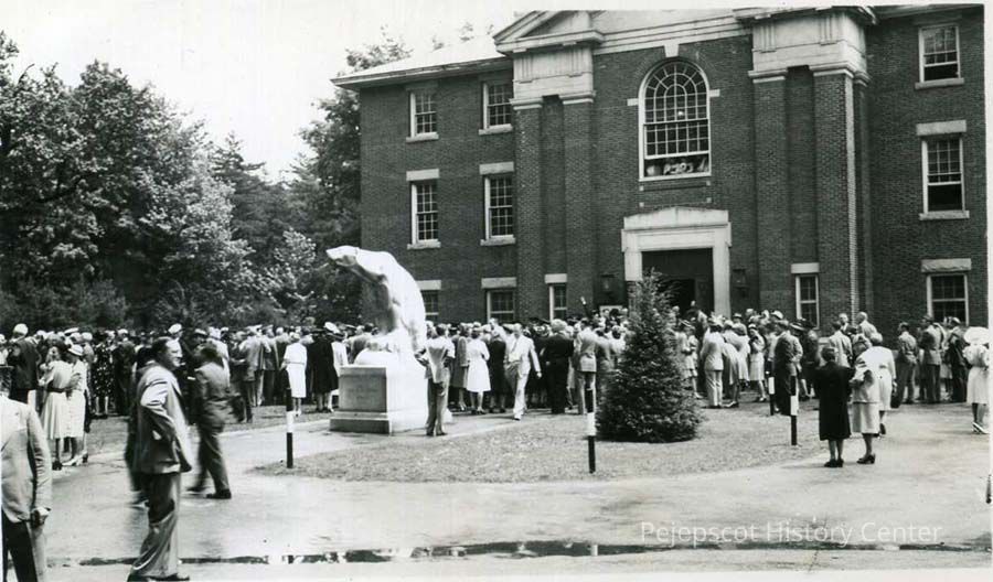 B/W photo of crowd at Bowdoin College Commencement, June 8, 1946. Bowdoin Polar Bear in the middle.