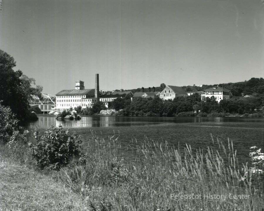 B/W photo of Bowdoin Mill, Topsham, ME. No date. From northeast across the river, looking towards the southwest.