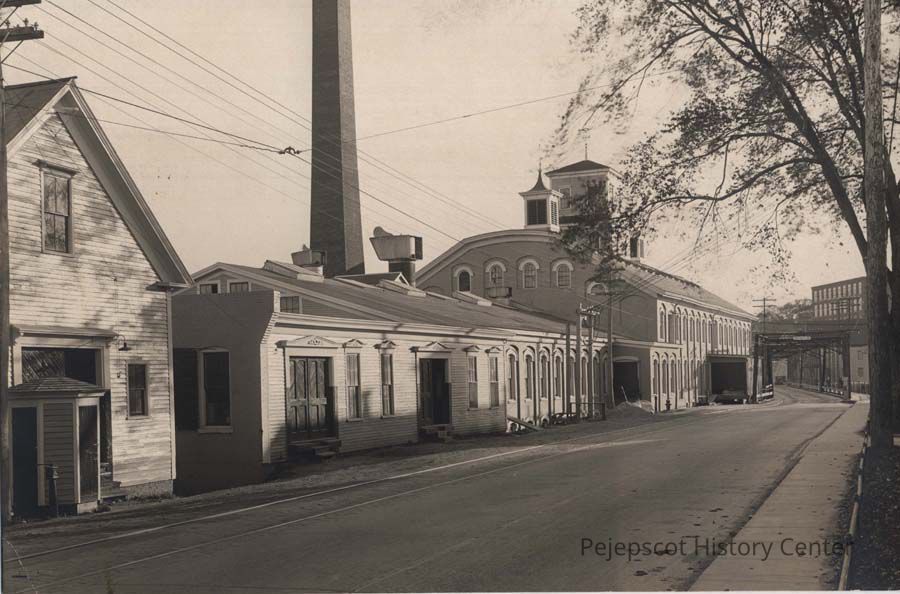 B/W photo of the Bowdoin Mill looking from Topsham toward Brunswick. Undated