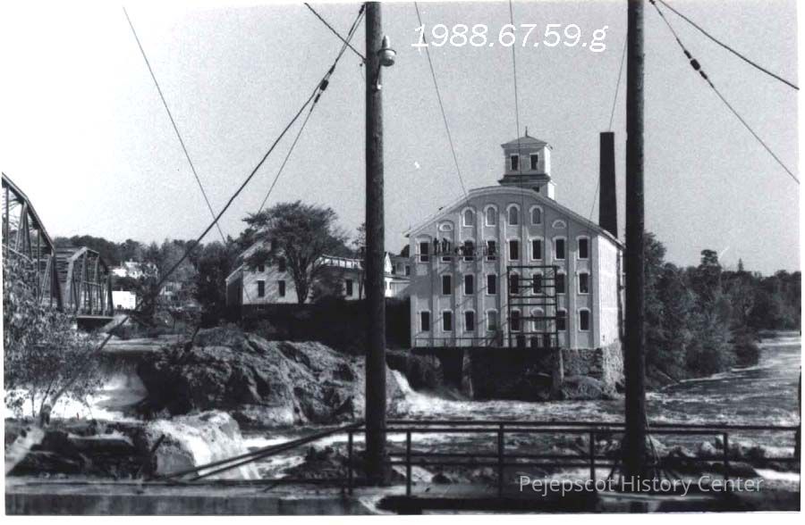Looking northeast at the Bowdoin Mill building across the Androscoggin River.