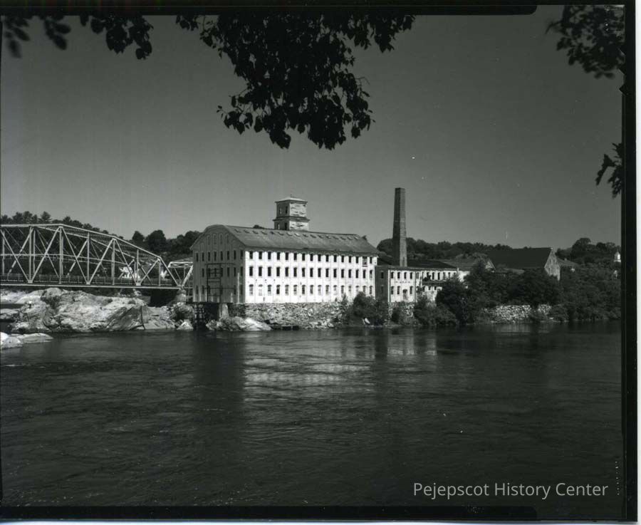 B/W photo Bowdoin Mill, Topsham, ME. No date. Overall view of Mill. From south across the river to the north.