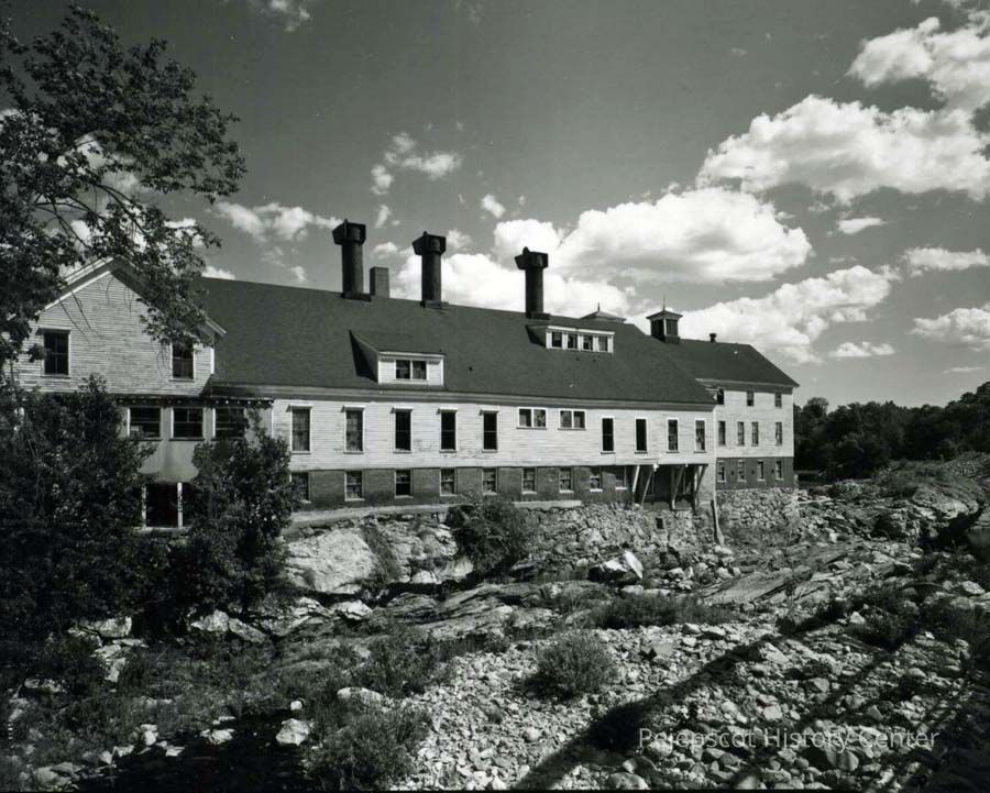 B/W photo of the Bowdoin Mill, Topsham, ME, west side of Buildings 5, 3 & 1. No date.
