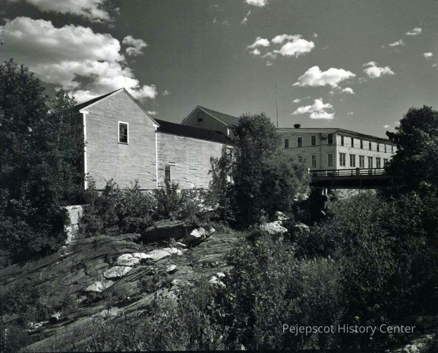 B/W photo of the Bowdoin Mill, Topsham, ME, looking across Granny Hole Stream, west side of Buildings Y-1, Y-2 and 6. No date.