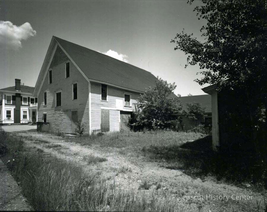 B/W photo of the Bowdoin Mill, Old Main Street, Topsham, ME, buildings 9 & 8. No date.