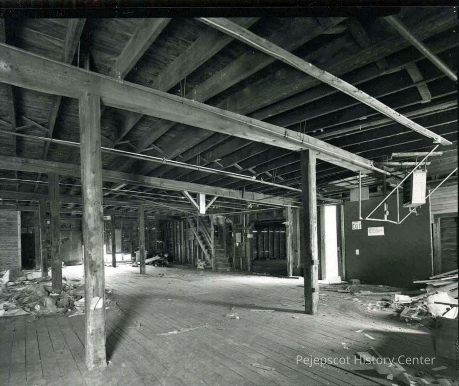 B/W photo of the Bowdoin Mill, Topsham, ME, interior of first floor, building 8. No date.