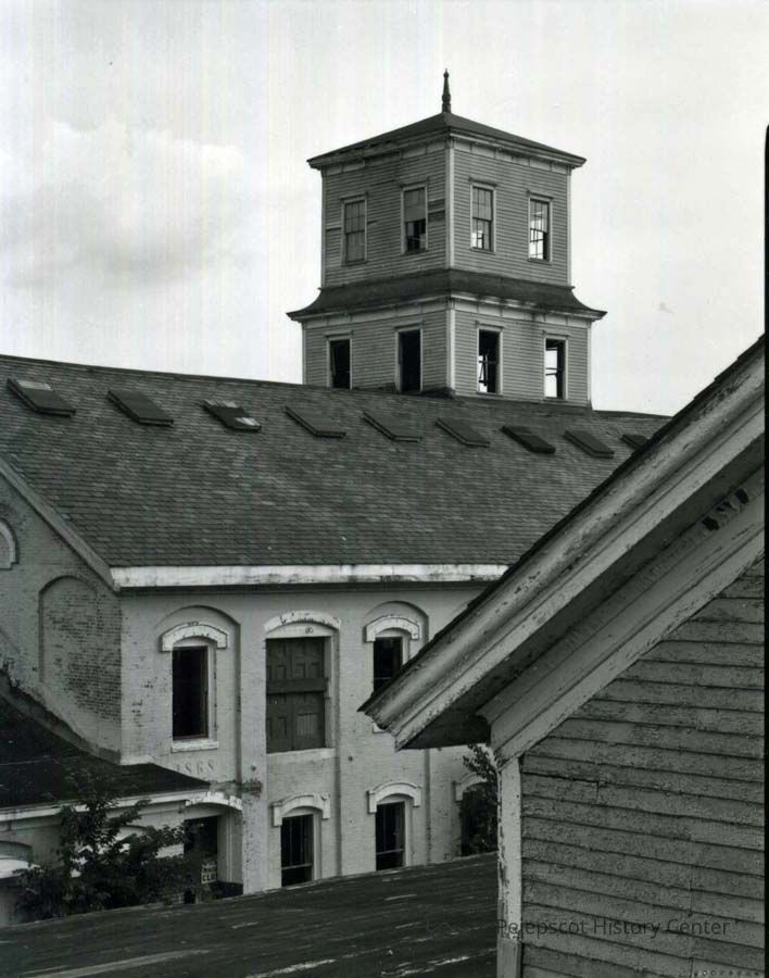 B/W photo of the Bowdoin Mill, Topsham, ME, view of building 13 from roof of building 4. No date.