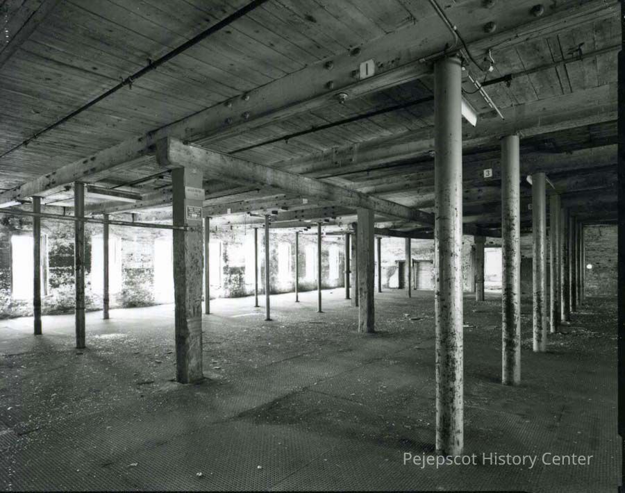 B/W photo of Bowdoin Mill, Topsham, ME, interior of building 13 ground floor. No date.