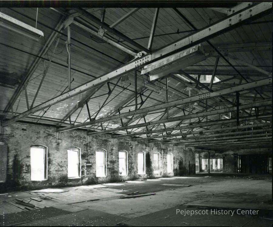 B/W photo of the Bowdoin Mill, Topsham, ME, interior of building 11, ground floor. No date.