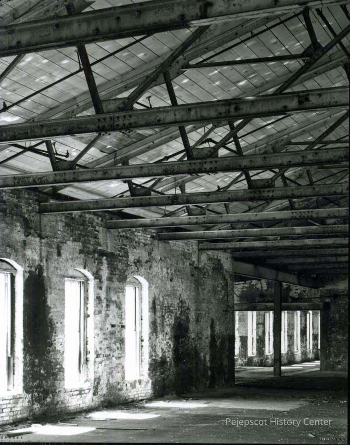 B/W photo of Bowdoin Mill, Topsham, ME, interior of building 11, detail of trusses. No date.