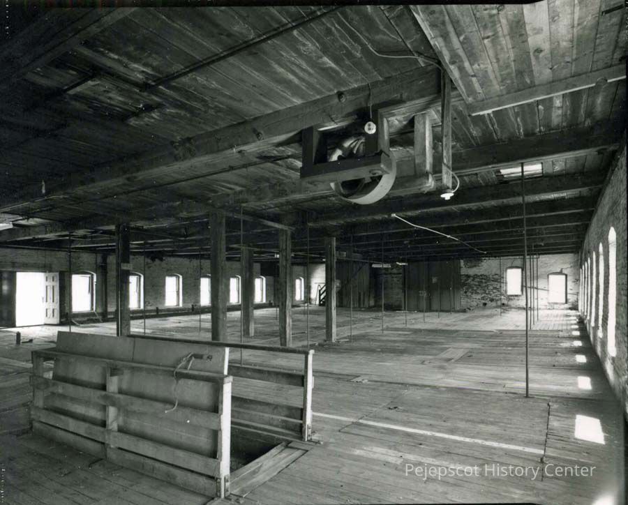 B/W photo of the Bowdoin Mill, Topsham, ME, interior of building 13, showing pulley wheel and stairs. No date.