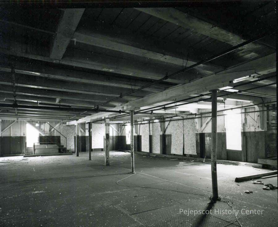B/W photo of Bowdoin Mill, Topsham, ME, interior of building 1, showing knee braces on west wall and stairs on south end. No date.
