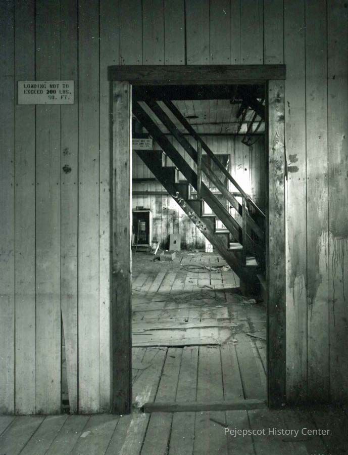 B/W photo of Bowdoin Mill, Topsham, ME, interior of building 1, second floor, looking through doorway from building 1 to building 2, showing stairway. No date.