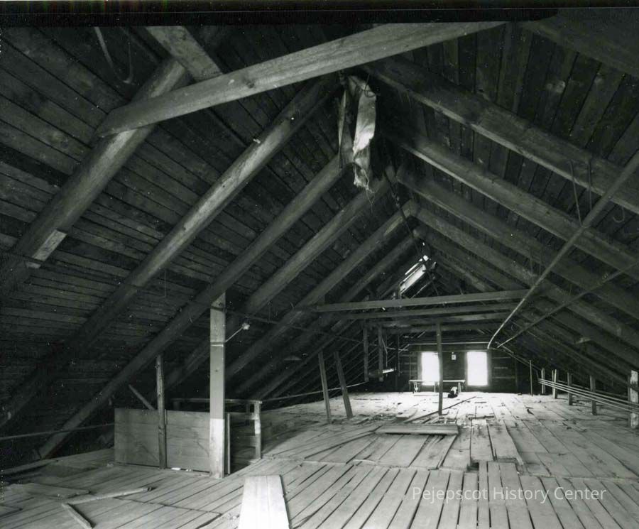 B/W photo of Bowdoin Mill, Topsham, ME, interior of building 1 attic. No date.